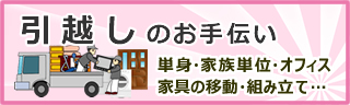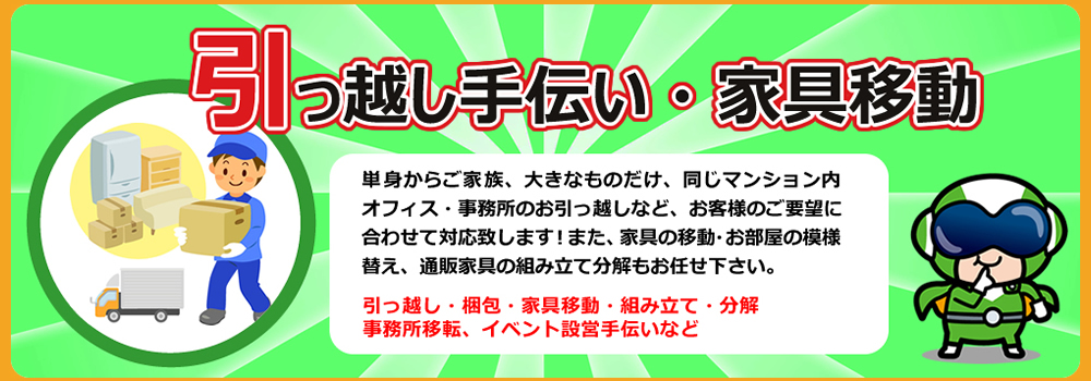 単身からご家族単位、大きなものだけ、同マンション内、オフィスのお引越しなどお客様のご要望に合わせ対応いたします。また、家具の移動、お部屋の模様替え、通販家具の組立て・分解などもお任せください。 引越・梱包・積込手伝い・家具移動・組立・分解 事務所移転、イベント設営手伝いなど